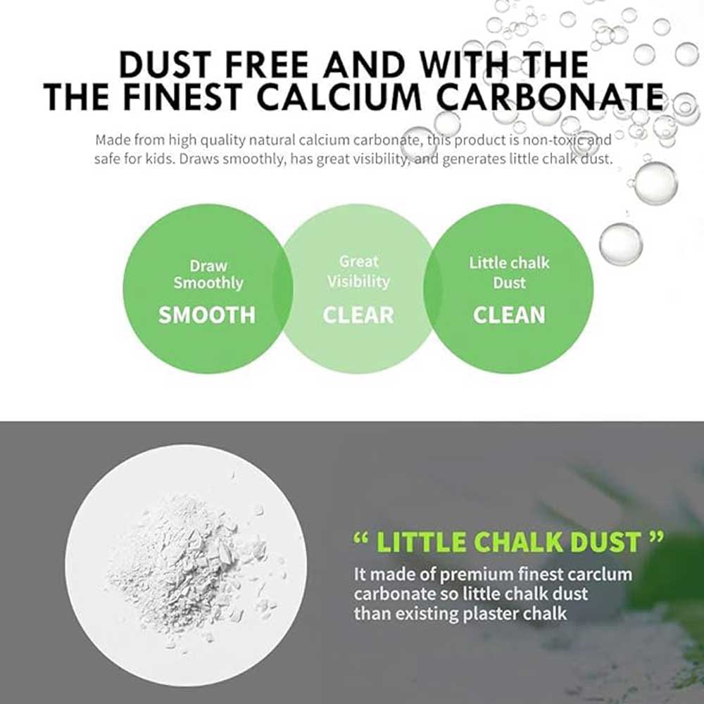 間違いなし:私たちのチョークは、削除するときに、黒板に残留物をほとんど、あるいはまったく残さず簡単に消去されます。チョークは不要恒久的な跡を残さずに、ほとんどの衣類で簡単に洗うことができます。チョークは、ほこりや放射性降下物がほとんど発生せず、文を書いたり、描画するときに住所または台無しになる可能性が最小限に抑えます。